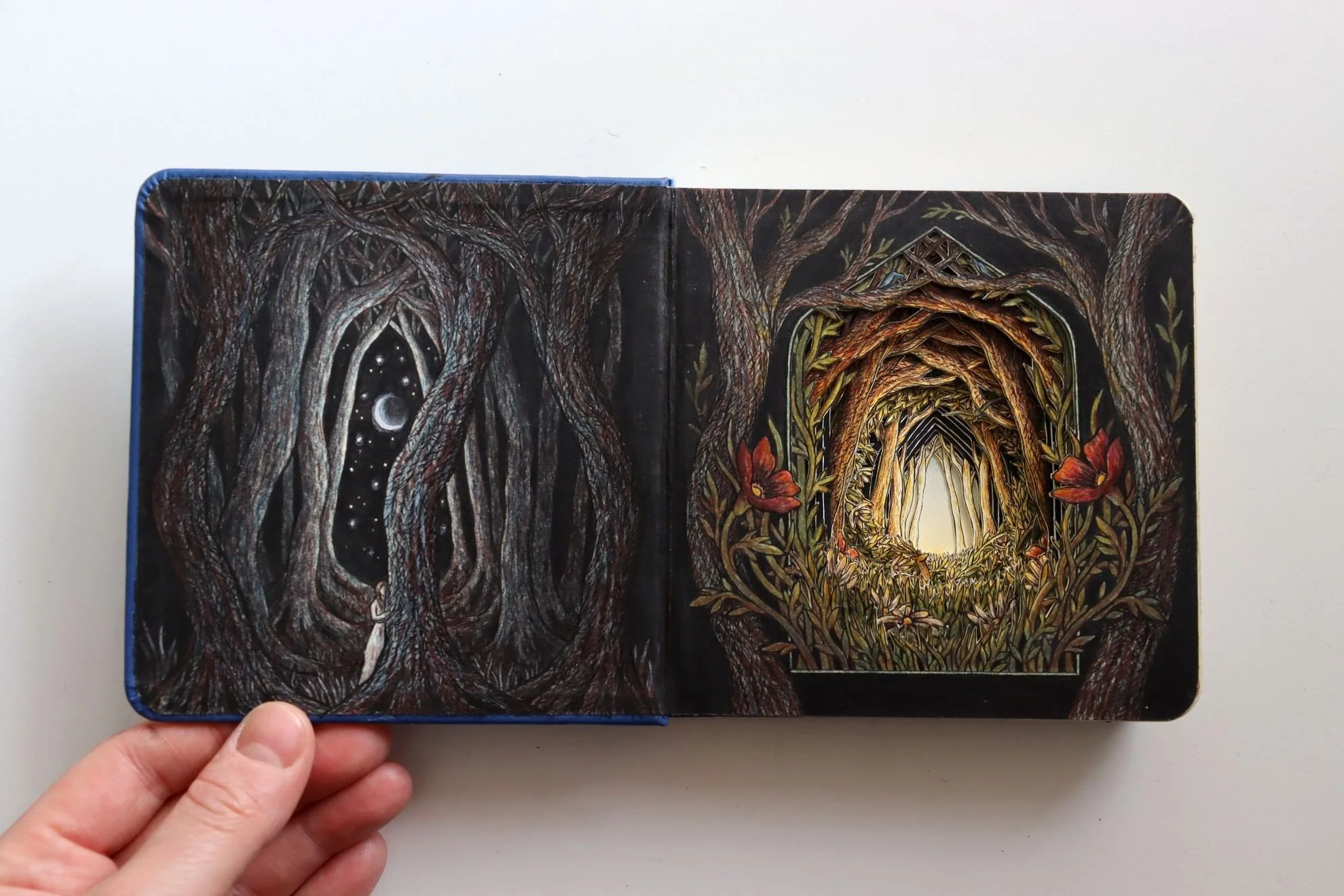 Repurposed Art Creation sketchbook, 12x12cm, 140g paper, blue exterior. Created using ink and colour pencil, sprayed with UV light protectant.