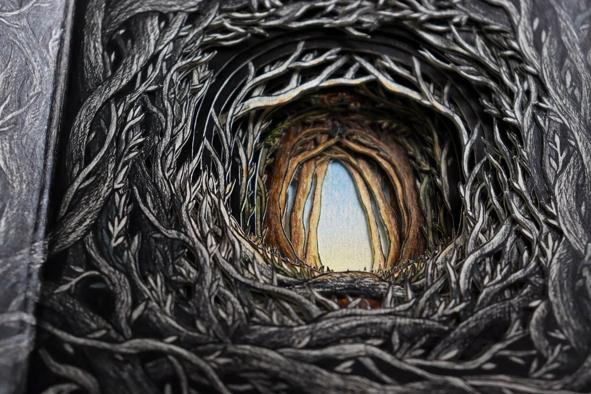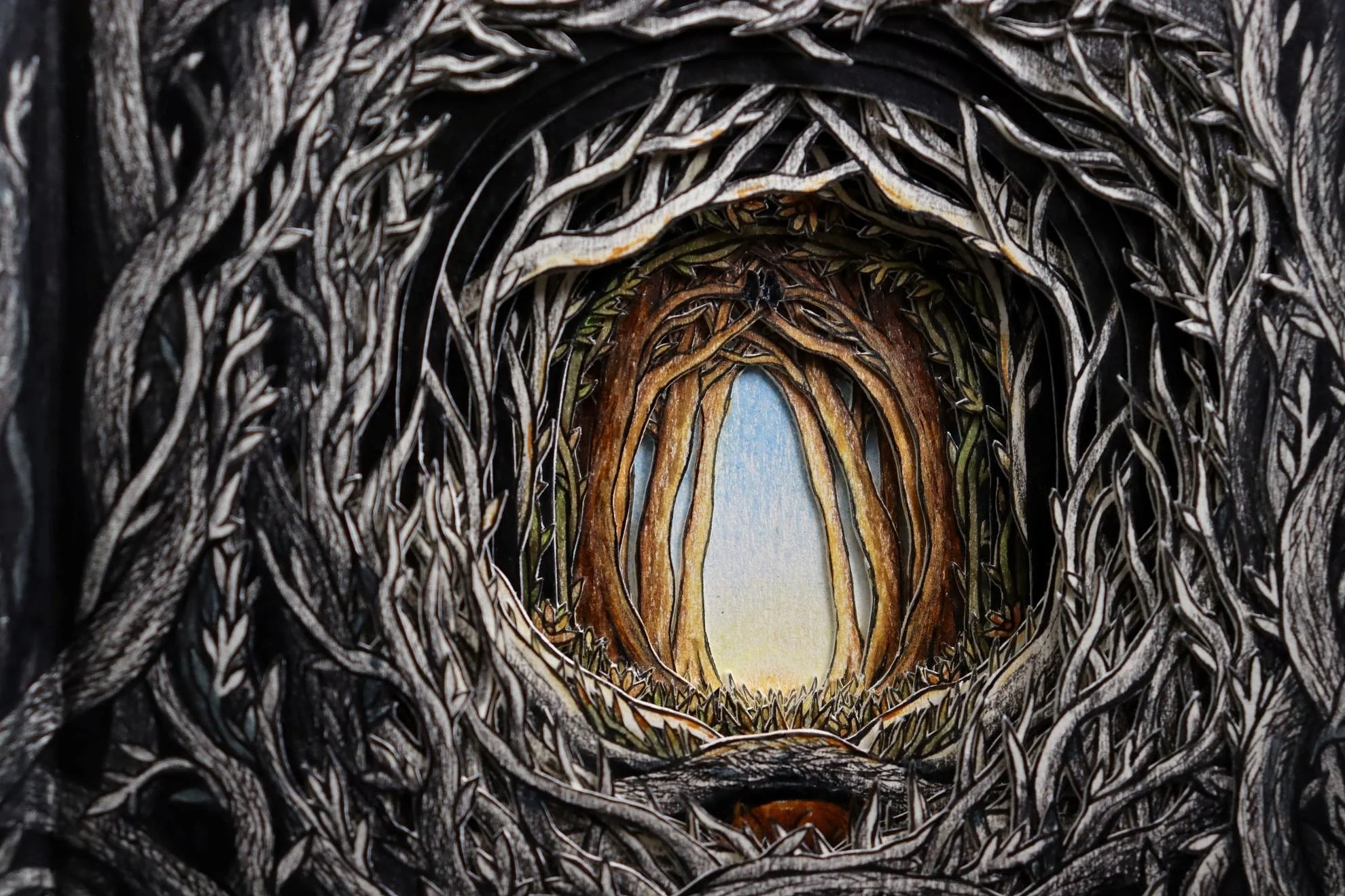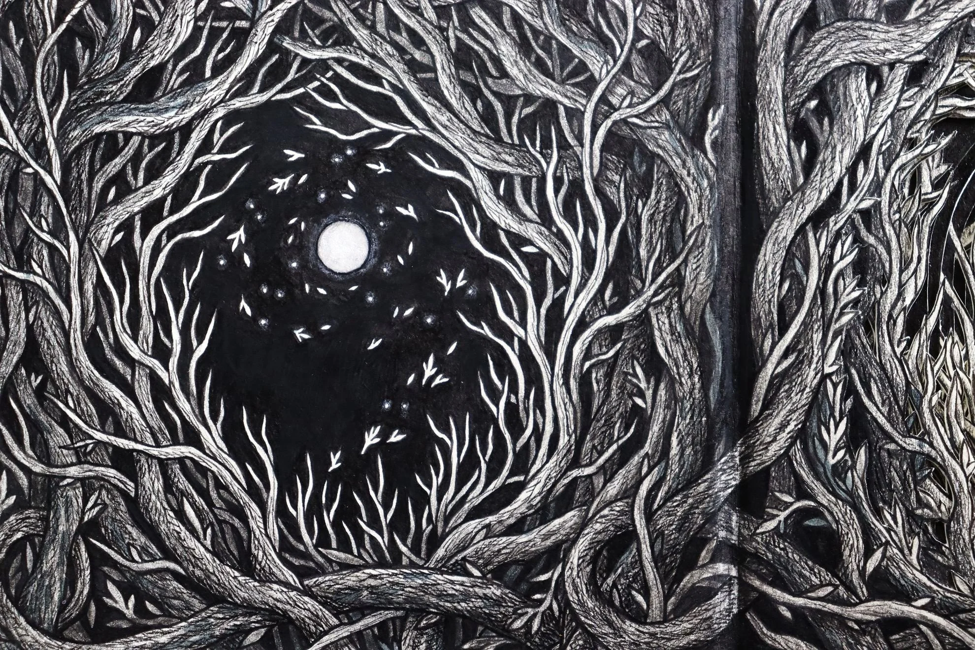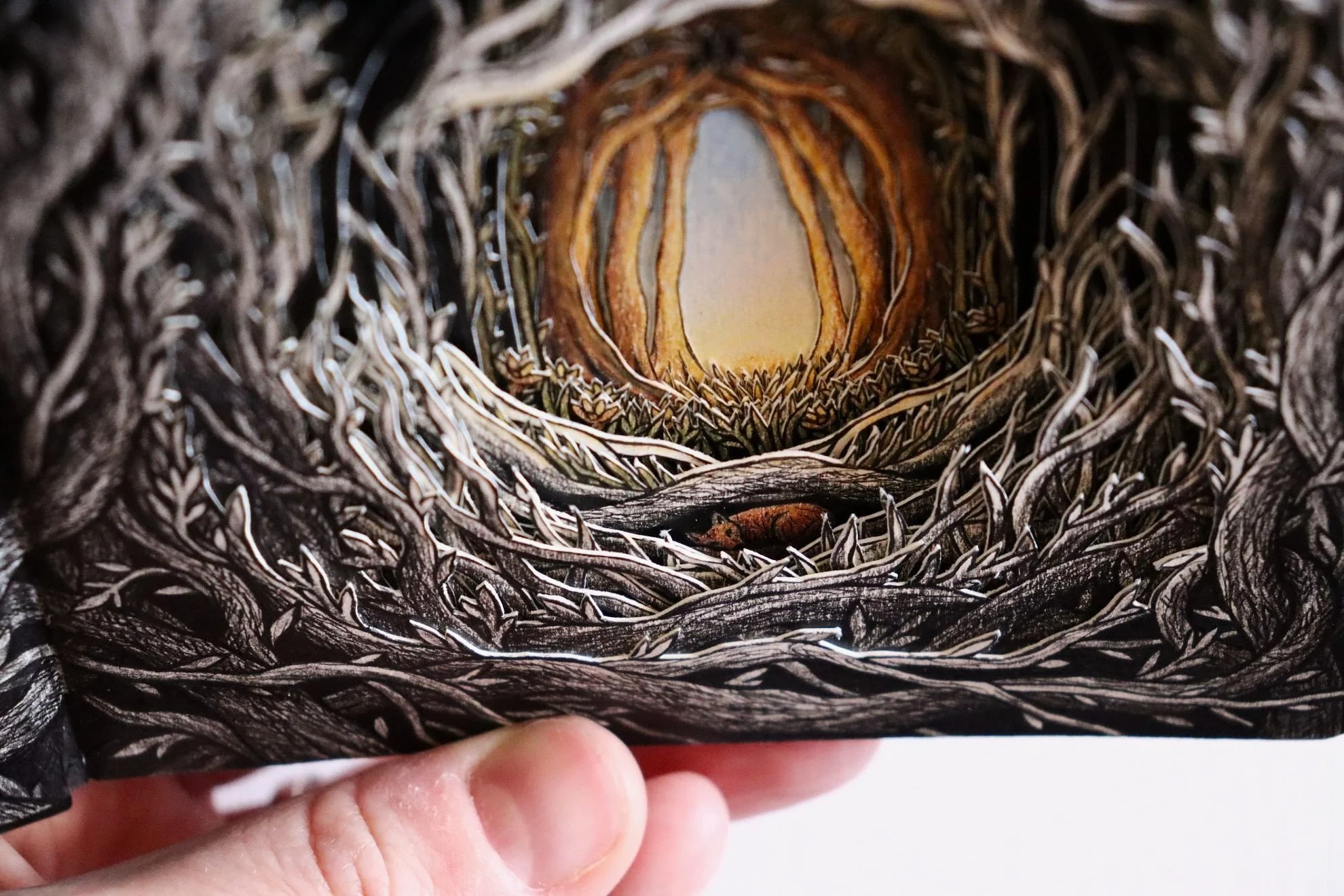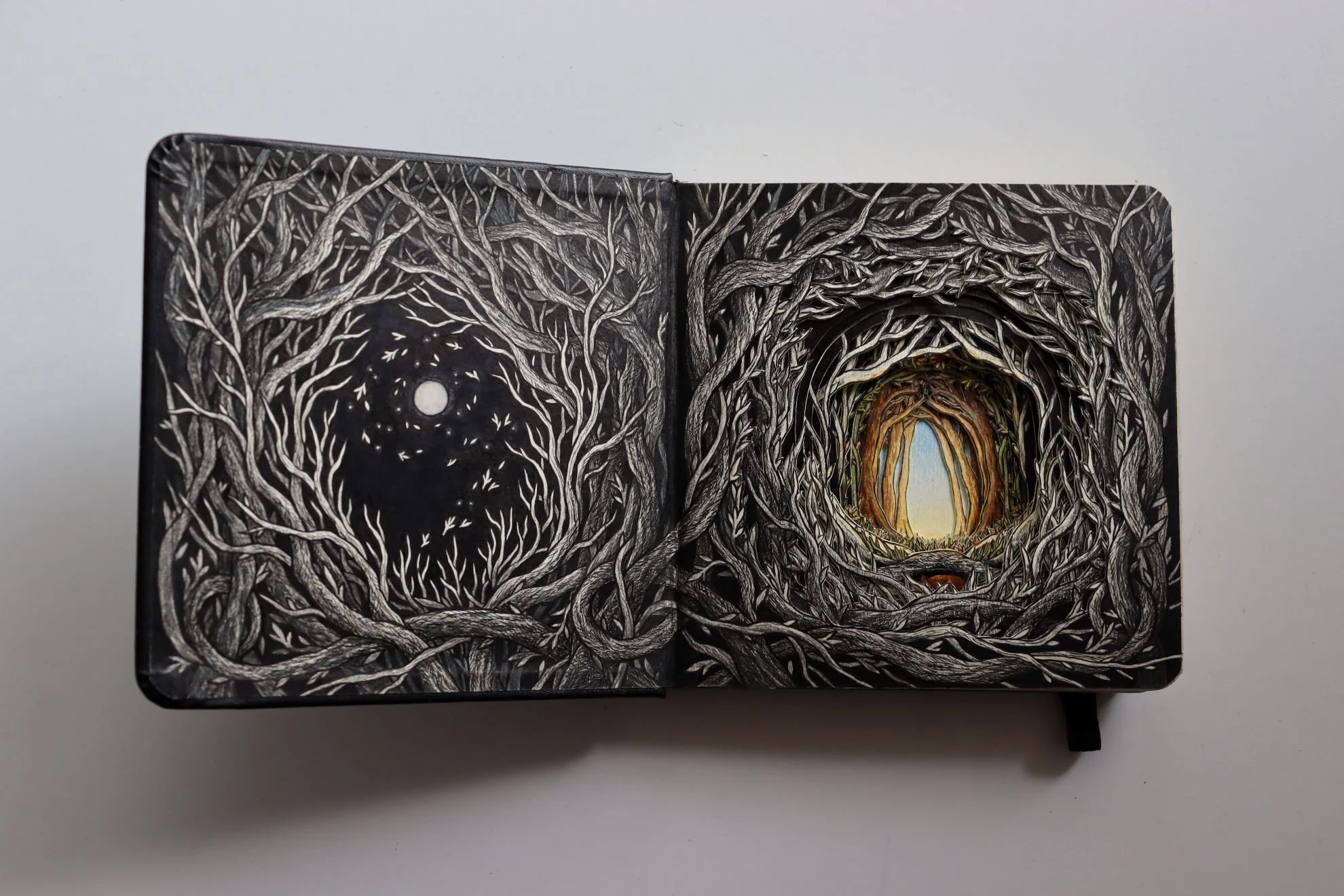 Repurposed Art Creation sketchbook, 12x12cm, 140g paper, black exterior. Created using ink and colour pencil, sprayed with UV light protectant.