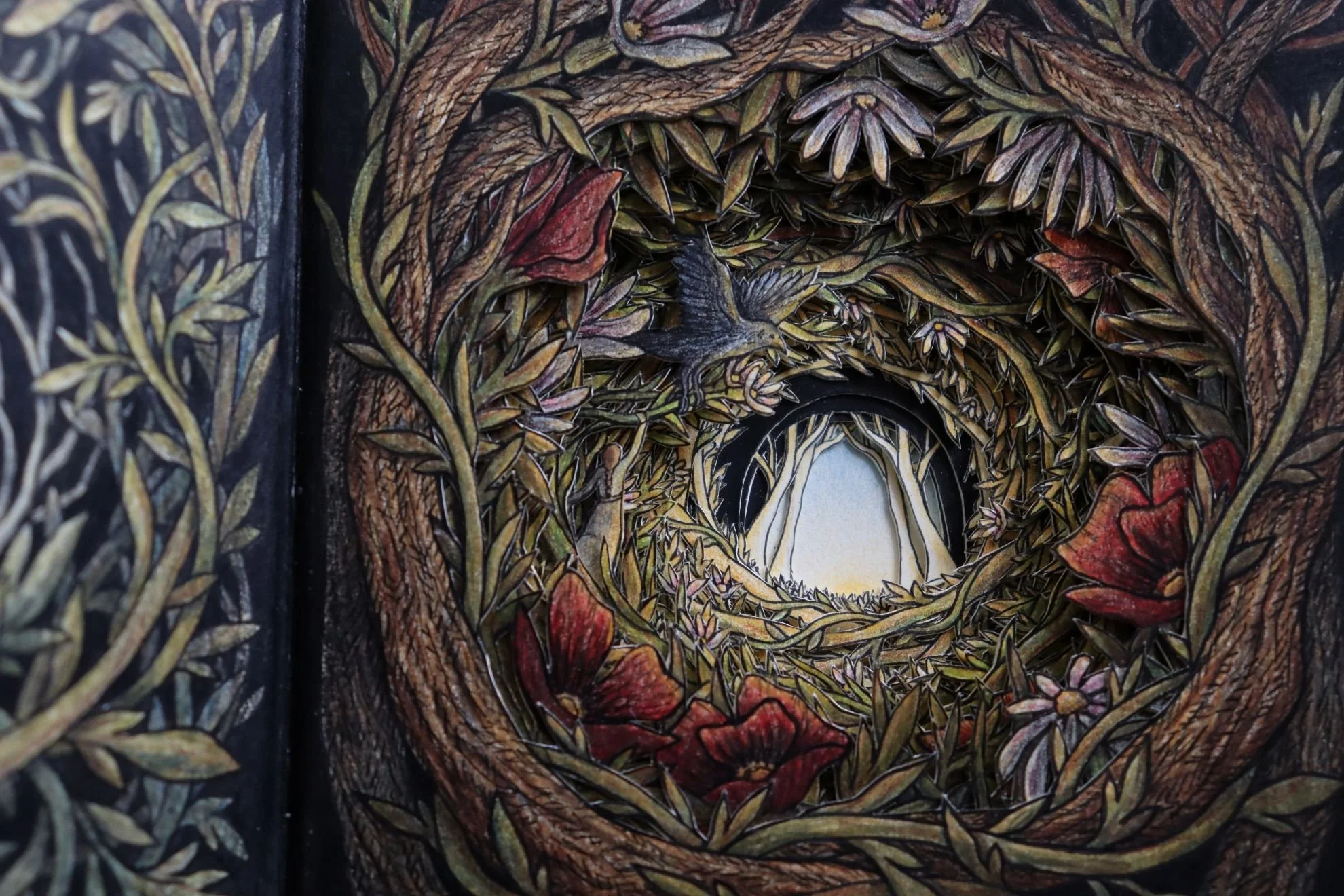Repurposed Art Creation sketchbook, 12x12cm, 140g paper, black exterior. Created using ink and colour pencil, sprayed with UV light protectant.